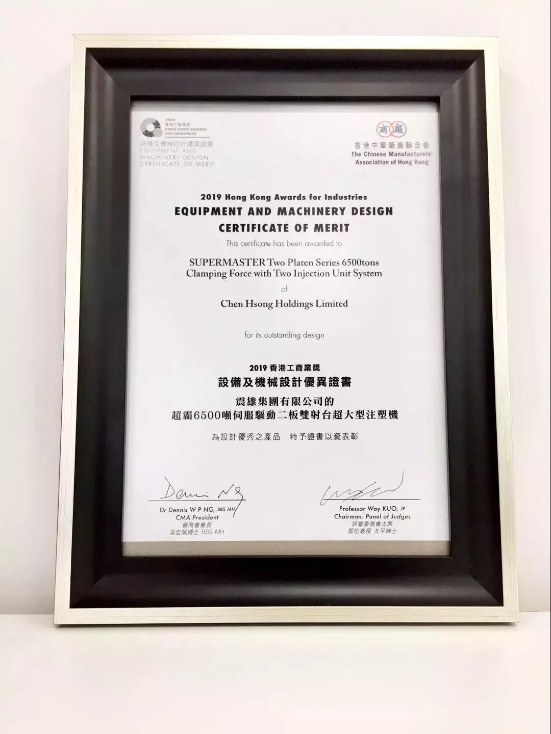 超霸6500噸伺服驅(qū)動二板雙射臺超大型注塑機獲得香港工商業(yè)獎之優(yōu)異證書獎