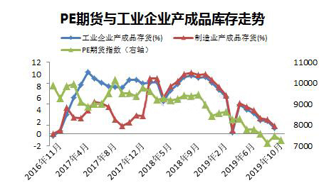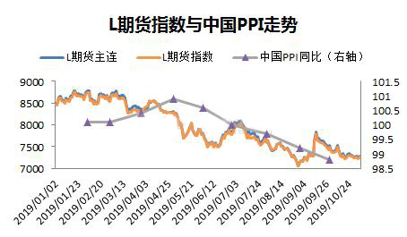 ????????2019年月初以來價格數(shù)據(jù)顯示,PE期貨和現(xiàn)貨相關(guān)度極高,幾乎同步漲跌,因此以下的分析,取期貨價格指數(shù)跟宏觀指標(biāo)對比。