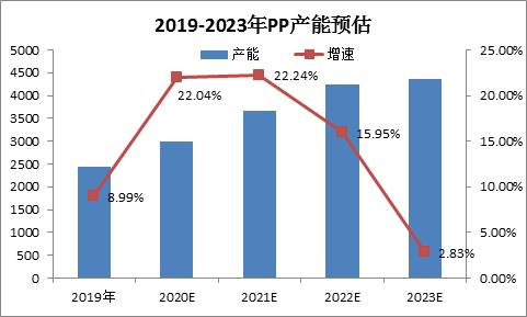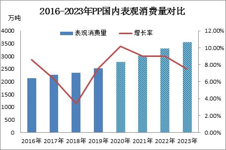 ????????2016-2020年PP表觀消費量呈現不規(guī)則“V”字型走勢,2020年之后受國內產能急劇上升之后有進入逐步放緩期,表觀消費在2020年之后將呈現震蕩小幅下挫趨勢。由上圖可發(fā)現,2016-2017年國內表觀消費量處于高位,在2018年急劇出現低位后快速攀升,主因2016-2017年正是國內經歷西北地區(qū)煤化工產能釋放后,集中供應期,市場需求也在穩(wěn)步攀升,助推國內表觀消費量處于高位,但進入2018年后受環(huán)保及資金收緊等各方面因素制約,前期預計投產裝置多數推遲,導致2018年擴能總量繼續(xù)減少,同時進口量同比增幅逐步下降,導致2018年表觀消費量呈現下降趨勢。2019年-2020年擴能再次進入高峰期,助推國內表觀消費量再次攀升至高位。2020-2023年,表觀消費量繼續(xù)增長,但因基數偏大,增速或將放緩。