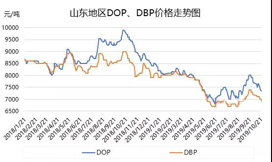 ????????如上圖所示,國(guó)內(nèi)DOP、DBP價(jià)格亦是不斷下行。就DOP而言,行業(yè)供應(yīng)充足,去庫(kù)存阻力重重,為減緩出貨阻力,市場(chǎng)低價(jià)不斷增加,疊加原料辛醇及苯酐跌勢(shì),偏空情緒維持,愈跌愈不買(mǎi)跌始終貫穿。但跌至目前價(jià)位:山東7300-7500元/噸自提,江蘇7500元/噸自提,華南7800-7900元/噸送到,加之辛醇尚未有新低價(jià)出現(xiàn),帶動(dòng)一定維價(jià),今日走勢(shì)呈現(xiàn)平穩(wěn),雖然接近心理價(jià)位,但缺乏實(shí)質(zhì)利好基礎(chǔ)上,仍多謹(jǐn)慎。就DBP而言,行業(yè)整體開(kāi)工負(fù)荷不高,庫(kù)存壓力不大,且原料丁醇及萘系苯酐,一走勢(shì)基本平穩(wěn),一走勢(shì)破位下行,導(dǎo)致市場(chǎng)雖然下行,但波動(dòng)基本窄幅度。