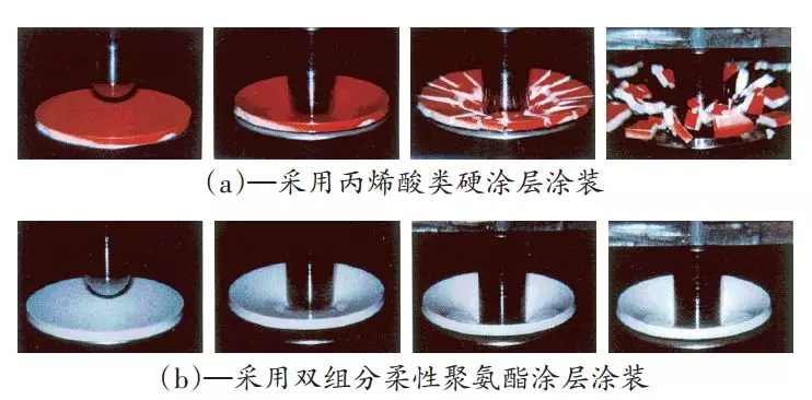 ????????底漆通常有淺灰色和深灰色,也有采用與色漆顏色類似或相同的顏色。底漆的主要功能在于有效覆蓋塑料底材缺陷,并能提高基材附著力。對(duì)于保險(xiǎn)杠底漆來說,還要具備優(yōu)良的重涂性、耐水性、以及低溫耐沖擊能力等。對(duì)于汽車而言,保險(xiǎn)杠還要求具有良好的安全功能。所以保險(xiǎn)杠涂料還必須具備一定的外力緩沖作用,從而起到對(duì)駕駛員和乘車者的防護(hù)。聚氨酯底漆的韌性正能滿足這一要求,水性聚氨酯底漆性能尤佳。圖6是不同涂層對(duì)塑料基材的保護(hù)效果實(shí)驗(yàn)。