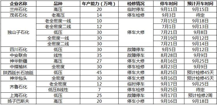 ????????9月份國內PE裝置檢修較上月稍有減少,PE共計損失量16.8萬噸。月內神華包頭全密度裝置、延能化低壓裝置大修,茂名石化老高壓停車檢修、上海石化低壓裝置故障停車目前仍未重啟。神華新疆高壓裝置、獨山子石化全套PE裝置、中安聯(lián)合線性裝置、中煤榆林全密度裝置開車,揚子巴斯夫、蘭州石化高壓裝置、四川石化低壓裝置月內短暫停車目前均已經重啟。整體來看,9月中下旬部分石化檢修裝置陸續(xù)重啟,國內PE供應較前期緩慢增加。