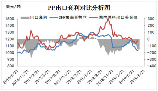 ????????面對(duì)國(guó)內(nèi)PP產(chǎn)能激增時(shí)代,無(wú)論是貿(mào)易還是生產(chǎn)企業(yè)都在謀求出路,于是出口成為多數(shù)業(yè)者最佳選擇。由PP出口套利對(duì)比分析中發(fā)現(xiàn),以CFR東南亞拉絲為例,國(guó)內(nèi)PP拉絲產(chǎn)品出口到東南亞價(jià)格仍高于當(dāng)?shù)貎r(jià)100-150元/噸,而且照目前兩者價(jià)差發(fā)展趨勢(shì)發(fā)現(xiàn),國(guó)內(nèi)市場(chǎng)在8月底至9月初正是下游需求逐步恢復(fù)之際,國(guó)內(nèi)價(jià)格有抬高可能,短期仍不適合開(kāi)啟出口窗口。