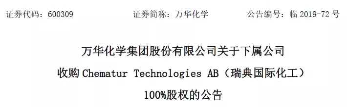 ????????2019年7月31日,萬華化學(xué)公告稱,萬華化學(xué)集團股份有限公司(以下簡稱“萬華化學(xué)”)境外全資下屬公司萬華化學(xué)(匈牙利)控股有限公司收購吉林市康乃爾投資集團有限公司(以下簡稱“康乃爾”)和歐美能源技術(shù)有限公司持有的Chematur Technologies AB (以下簡稱“瑞典國際化工”)100%股權(quán)。本次收購為有條件收購,總收購金額約等值人民幣925,445,229元。