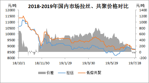 ????????進入7月份以來,隨著PP期貨的大幅拉漲,作為標品的PP拉絲跟漲迅速,作為非標品的共聚,漲幅跟進較為緩慢,國內(nèi)聚丙烯現(xiàn)貨市場拉絲與共聚市場價格出現(xiàn)平水的現(xiàn)象,從2016年至今拉絲與共聚平水的現(xiàn)象僅出現(xiàn)過兩次,目前已經(jīng)進入倒掛態(tài)勢,拉絲價格高出共聚300元/噸之多。