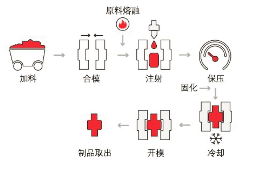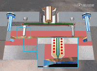 3.在柱塞或螺桿的加壓下物料被壓縮并向前移動,通過機筒前的射嘴以很快的速度注入較低溫度的閉合模腔內(nèi);