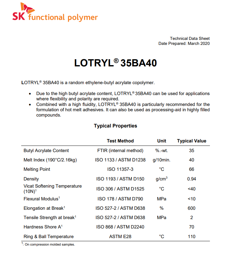 - 阿科瑪增韌劑相容劑EBA Lotryl 35BA40 物性表, 阿科瑪增韌劑相容劑EBA Lotryl 35BA40 產(chǎn)品參數(shù),阿科瑪增韌劑相容劑EBA Lotryl 35BA40 性能表,阿科瑪增韌劑相容劑EBA Lotryl 35BA40 出廠報(bào)告, MSDS,, 物質(zhì)安全資料表, UL黃卡,{ SGS報(bào)告, RoHS, 食品級認(rèn)證, NSF飲用水標(biāo)準(zhǔn), 產(chǎn)品資料, 產(chǎn)品性能, 出廠報(bào)告, 原廠原包, 代理商, 熱變形溫度, 熔指數(shù), 流動(dòng)系數(shù), 抗沖擊性能、沖擊強(qiáng)度, 低溫韌性、低溫抗沖擊性能, 熔體流動(dòng)系數(shù)、熔體流動(dòng)速率, 加工工藝、加工參數(shù)、加工溫度, 歐盟RoHS 德國FDA 美國FDA 日本FDA