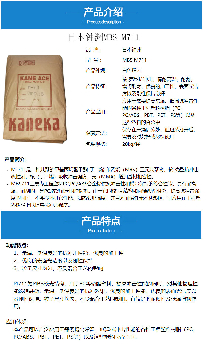 - MBS日本鐘淵M711 耐寒耐候增韌劑 PC抗沖擊改性劑 鐘淵mbs711 物性表, MBS日本鐘淵M711 耐寒耐候增韌劑 PC抗沖擊改性劑 鐘淵mbs711 產(chǎn)品參數(shù),MBS日本鐘淵M711 耐寒耐候增韌劑 PC抗沖擊改性劑 鐘淵mbs711 性能表,MBS日本鐘淵M711 耐寒耐候增韌劑 PC抗沖擊改性劑 鐘淵mbs711 出廠報(bào)告, MSDS,, 物質(zhì)安全資料表, UL黃卡,{ SGS報(bào)告, RoHS, 食品級(jí)認(rèn)證, NSF飲用水標(biāo)準(zhǔn), 產(chǎn)品資料, 產(chǎn)品性能, 出廠報(bào)告, 原廠原包, 代理商, 熱變形溫度, 熔指數(shù), 流動(dòng)系數(shù), 抗沖擊性能、沖擊強(qiáng)度, 低溫韌性、低溫抗沖擊性能, 熔體流動(dòng)系數(shù)、熔體流動(dòng)速率, 加工工藝、加工參數(shù)、加工溫度, 歐盟RoHS 德國(guó)FDA 美國(guó)FDA 日本FDA