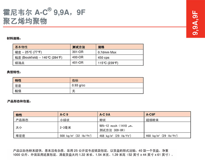 - 霍尼韋爾 AC® 9 低密度聚乙烯 (LDPE) 均聚物 物性表, 霍尼韋爾 AC® 9 低密度聚乙烯 (LDPE) 均聚物 產(chǎn)品參數(shù),霍尼韋爾 AC® 9 低密度聚乙烯 (LDPE) 均聚物 性能表,霍尼韋爾 AC® 9 低密度聚乙烯 (LDPE) 均聚物 出廠報(bào)告, MSDS,, 物質(zhì)安全資料表, UL黃卡,{ SGS報(bào)告, RoHS, 食品級認(rèn)證, NSF飲用水標(biāo)準(zhǔn), 產(chǎn)品資料, 產(chǎn)品性能, 出廠報(bào)告, 原廠原包, 代理商, 熱變形溫度, 熔指數(shù), 流動系數(shù), 抗沖擊性能、沖擊強(qiáng)度, 低溫韌性、低溫抗沖擊性能, 熔體流動系數(shù)、熔體流動速率, 加工工藝、加工參數(shù)、加工溫度, 歐盟RoHS 德國FDA 美國FDA 日本FDA