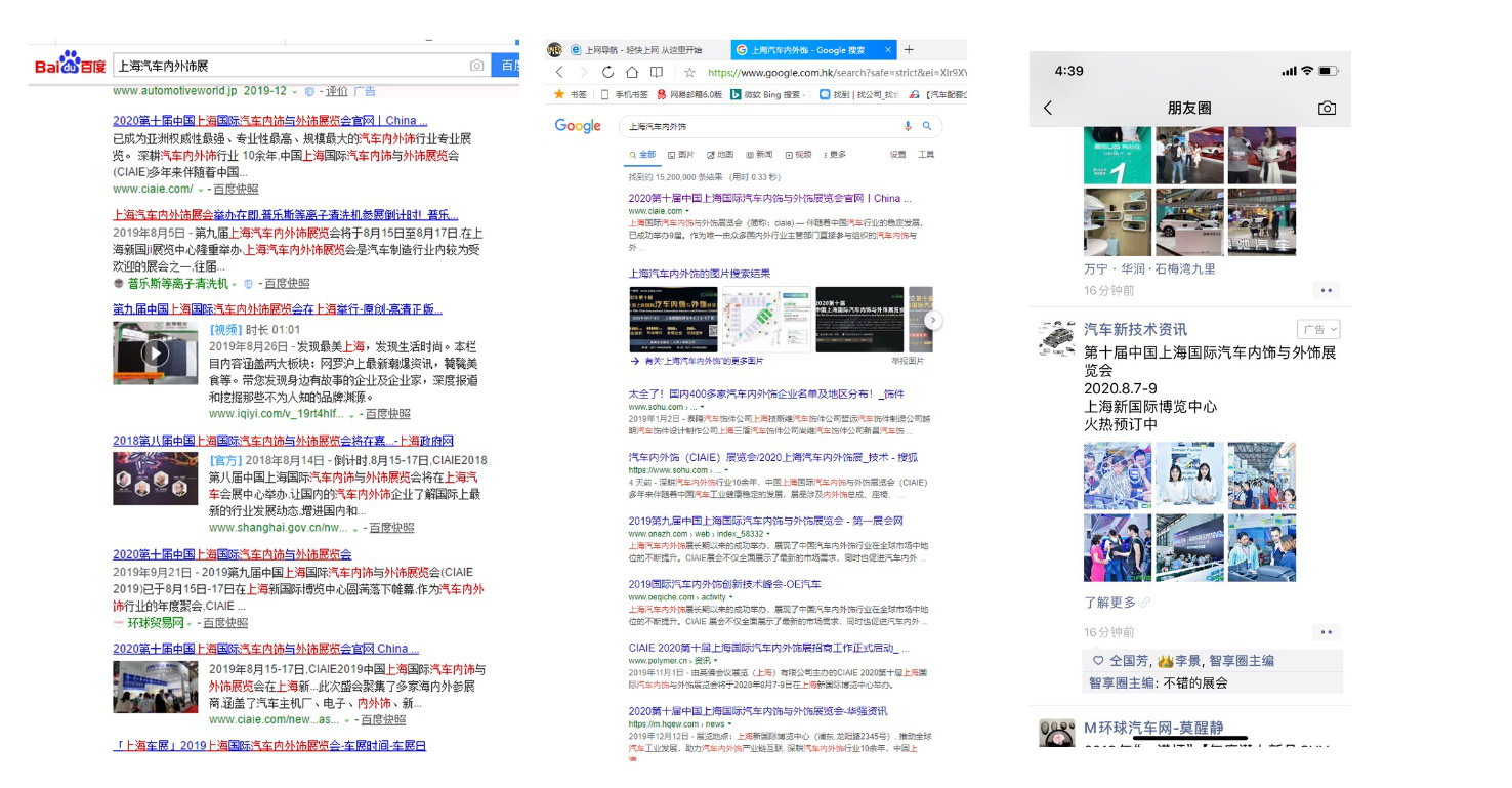????????相對往屆,CIAIE組委會今年高度重視傳播手段建設(shè)和創(chuàng)新,積極推進改革創(chuàng)新,堅持融媒體呈現(xiàn),內(nèi)宣外宣社宣網(wǎng)宣聯(lián)動,全媒體同步發(fā)力,建立多樣化、多渠道、全方位的宣傳矩陣,陣容空前強大,線上聚焦行業(yè)知名媒體、微信朋友圈廣告、信息流廣告、百度推廣、新媒體平臺、微信公眾號、電子郵件、短信等,線下定位核心雜志期刊、江浙滬區(qū)核心路段路牌廣告、機場廣告、核心汽車產(chǎn)業(yè)商圈廣告、同類型展會地推、郵寄入場券等深入展會宣傳,另有創(chuàng)新性互動式的投票活動推廣、展會現(xiàn)場直播,全方位、立體式推廣,打造全方面、多層次的宣傳格局。