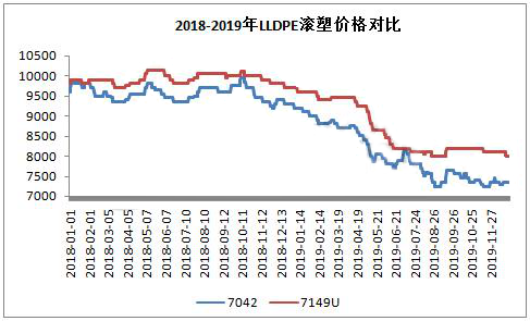 ????????從圖中顯示,2018-2019年國內(nèi)滾塑料價格明顯高于普通線性,且價格差距逐步擴大,2019年較普通線性高50-850元/噸。目前國內(nèi)聚烯烴行業(yè)產(chǎn)能過剩,國內(nèi)石化一直致力于高端產(chǎn)品研發(fā),搶占高端領(lǐng)域,以獲取較大利潤。從線性區(qū)域來看,由于產(chǎn)能過剩,7042價格近兩年一直處于下行通道,削減了石化利潤。線性行業(yè),近年來,研發(fā)主要方向集中在C8線性,茂金屬、滾塑料等,其中滾塑料做為一個分支,近年研發(fā)較多。