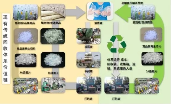 ????????在舊的PET價值鏈中,PET回收、分選和打包站,都是靠拾荒人群,沒有環(huán)保成本和對工人的保護,物流效率低下,瓶片賣到化纖企業(yè),再生產品沒有很高附加值。而現(xiàn)在這種模式已經難以為繼,品牌企業(yè)的加入,對于高品質可追溯PET瓶的要求,城市垃圾分類,環(huán)保執(zhí)法,致使拾荒人群逐步消失,取而代之的是高品質回收體系,回收+互聯(lián)模式的構建,同時這也增加了回收系統(tǒng)的成本。用再靠賣給化纖工廠這些方式已經不能的低端低值應用,無法維持PET的價值鏈。