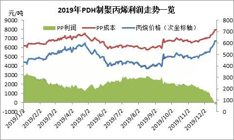 ????????從跟蹤的PDH產(chǎn)業(yè)利潤來看,丙烷脫氫制聚丙烯盈利情況持續(xù)較好,以華東產(chǎn)品為例,2018年理論盈利在2640元/噸,2019年1-11月份盈利在2184元,持續(xù)強(qiáng)于其他工藝盈利水平。然進(jìn)入12月份,國內(nèi)液化石油氣價格受國際市場大漲及國內(nèi)進(jìn)口資源價格大幅上行帶動,各個地區(qū)出現(xiàn)不同幅度調(diào)漲,丙烷價格大幅飆升,自11月初至12月底,丙烷國際價格漲幅高達(dá)150美元/噸,而反觀國內(nèi)聚丙烯價格,自11月初至12月底,卻出現(xiàn)了大幅下滑,一再創(chuàng)下年內(nèi)新低點(diǎn)。丙烷脫氫路線制聚丙烯在中國聚丙烯市場話語權(quán)方面仍顯薄弱,對此輪聚丙大跌僅能被動接受,導(dǎo)致丙烷-PDH-PP路線利潤急速下滑,至12月下旬,已進(jìn)入虧損狀態(tài),考慮當(dāng)前市場售價,丙烷脫氫制聚丙烯單噸虧損已達(dá)200元/噸,且隨著國際市場丙烷價格持續(xù)走高,虧損仍有加劇擔(dān)憂。