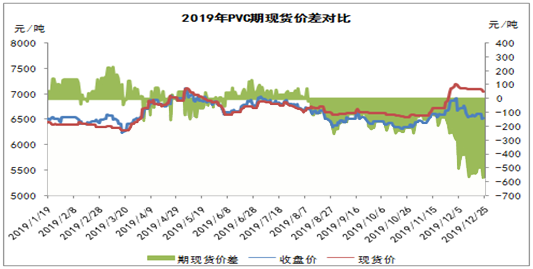 ????????近日,受市場供應(yīng)面有一定提升以及下游接貨不佳影響,PVC行情轉(zhuǎn)入跌勢。PVC期貨偏弱震蕩,對現(xiàn)貨市場價格形成一定打壓,市場價格承壓下跌。此外,期現(xiàn)貨價差再創(chuàng)新高,最高達570元/噸左右。由上圖可以看出,進入2019年四季度,PVC期限價差逐漸擴大,基本維持在500-600元/噸之間,而期貨價格遠遠低于現(xiàn)貨價格,超出正常范圍。因此單從期現(xiàn)價差方面看,后期將逐漸修復步入正軌,現(xiàn)貨大幅下降的可能性偏大。