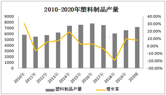 ????????由2010-2020年塑料制品產(chǎn)量數(shù)據(jù)分析發(fā)現(xiàn),國內(nèi)塑料制品增速呈現(xiàn)逐步放緩趨勢,尤其在經(jīng)歷了2014年高位之后,塑料制品整體增速呈現(xiàn)震蕩下滑趨勢。分析塑料制品快速下滑主要原因是國內(nèi)環(huán)保嚴(yán)查,同時在中美貿(mào)易戰(zhàn)影響下,代加工企業(yè)減少所致。2019年后塑料制品增速再度放緩,主因全球經(jīng)濟(jì)增長乏力,國內(nèi)經(jīng)濟(jì)環(huán)境影響下游制品企業(yè)訂單跟進(jìn)不足,導(dǎo)致塑料產(chǎn)品整體產(chǎn)量相對減少。
