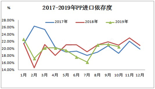 ????????2019年P(guān)P進(jìn)口依賴度呈現(xiàn)偏弱震蕩局勢,2019年1-10月進(jìn)口總量2099.19萬噸,較2018年1-10月份(總量1958.87萬噸)增加140.32萬噸,增幅7.16%。因國內(nèi)受環(huán)保嚴(yán)查,對進(jìn)口廢舊塑料實(shí)行嚴(yán)格禁止后,國內(nèi)對PP原料需求相應(yīng)增加,部分進(jìn)口資源相應(yīng)增加,以填補(bǔ)國內(nèi)需求。但PP進(jìn)口整體依賴度呈現(xiàn)逐步下降趨勢,目前2019年進(jìn)口依賴度平均值在19.63%,可見伴隨國內(nèi)產(chǎn)能不斷激增,部分國產(chǎn)料逐步替代進(jìn)口產(chǎn)品,進(jìn)口依賴度也相應(yīng)下降。