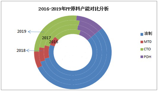 ????????由2016-2019年P(guān)P原料產(chǎn)能對比分析發(fā)現(xiàn),煤制烯烴產(chǎn)能增速最快,由2016年336萬噸增加到2019年633萬噸,增加297萬噸。其中2016年煤制烯烴產(chǎn)能占比18%,2019年煤制烯烴產(chǎn)能占比已經(jīng)高達(dá)26%,占比增加8%,其增速令人驚訝。另外PDH系列也是增速較快產(chǎn)品,由于丙烷脫氫產(chǎn)品因成本優(yōu)勢明顯,后期擴(kuò)能產(chǎn)品也將呈現(xiàn)新得突破。原料多元化,市場競爭壓力也將逐步升級。
