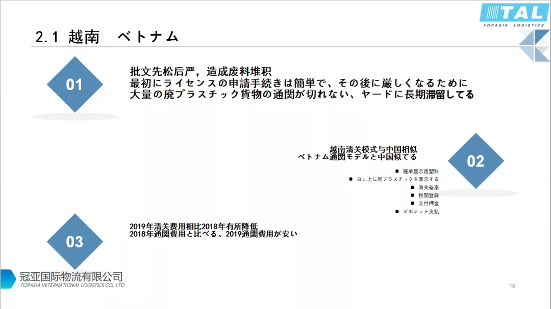 ????????有批文的還是可以正常清關(guān),通關(guān)時(shí)間也很迅速。越南廢料的清關(guān)模式跟之前中國(guó)很像,提單必須顯示廢塑料,收貨人需要在海關(guān)備案,進(jìn)口報(bào)關(guān)的時(shí)間需要支付押金。現(xiàn)在問(wèn)題是只有少數(shù)幾家船公司愿意接去越南的貨。相比2018年的情況,2019年下半年陸續(xù)出來(lái)很多新的批文,清關(guān)費(fèi)用也在逐步降低。
