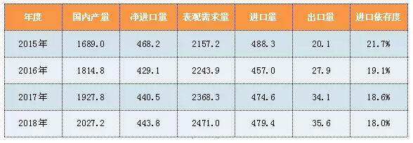 ????????2018年國內(nèi)聚丙烯粒料產(chǎn)量2027萬,進口量479萬噸,出口量36萬噸,表觀消費量2471萬噸,比2017年增加103萬噸,增長4.3%;進口依存度18.0%,比2017年下降0.6個百分點。