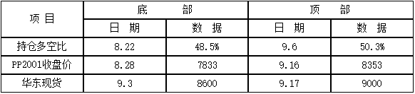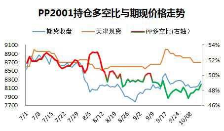 ????????第二、7月以來多空比曲線下行過程中,PP期現(xiàn)價(jià)格并不同步,多空比形成階段性底部和頂部相對領(lǐng)先,在50%臨界線之下,多單逐步增加,多空比逐步提升,此時(shí)配合基本面情況,有擇機(jī)介入短多的機(jī)會(huì)。多空比在8月22日達(dá)到階段性底部48.5%,之后開始一波反彈,多空比的底部領(lǐng)先期現(xiàn)價(jià)格一周左右時(shí)間,8月28日PP2001收盤7833元/噸,華東現(xiàn)貨在9月3日8600元/噸,相繼形成底部;9月6日,持倉多空比50.3%形成階段性頂部,且50%臨界線之上僅僅維持兩天就再次轉(zhuǎn)頭下行,此次多空比領(lǐng)先了期現(xiàn)價(jià)格10天左右??傊?dāng)多空比、期貨和現(xiàn)貨價(jià)格同向而行,“共振”之際,方可順勢而為。