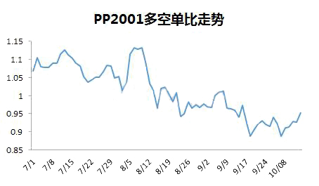 ????????放長時(shí)間看,自從2019年3月底到4月底,PP2001持倉多空比一直在50%臨界線之下,4月底到8月中旬,多空比在50%臨界線之上震蕩,8月中旬到目前在50%臨界線之下。跟基本面走勢并不吻合。當(dāng)多空比與期現(xiàn)價(jià)格走勢產(chǎn)生背離時(shí)候,要提高警惕,分析原因并判斷真實(shí)方向。PP2001合約在9月份換為主力合約,太長時(shí)間的參考意義不大。
