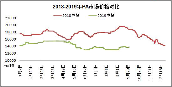????????PA66市場繼續(xù)下行,跌幅700元/噸。下游開工負(fù)荷仍較低,對PA66采購量有限,且對高價貨抵觸明顯。商家拋貨意向明顯,實盤商談空間加大。場內(nèi)交投氛圍仍較清淡。 截止月底PA6中粘切片13600-14000元/噸,PA66主流價格22600-22800元/噸。