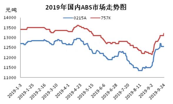 ????????2019年三季度,國內(nèi)ABS市場呈現(xiàn)出先抑后揚的態(tài)勢,以余姚市場吉化0215A為例,價格運行區(qū)間在11350-12700元/噸。