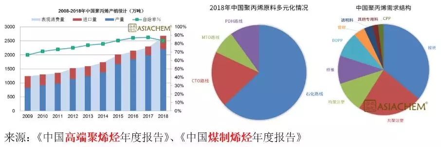 ????????聚丙烯(PP)是需求量最大的通用聚烯烴(PO)產(chǎn)品之一,在全球的消費量僅次于聚乙烯(PE)。中國是PP生產(chǎn)和消費大國。亞化咨詢數(shù)據(jù)顯示,截至2018年底中國已建成投產(chǎn)PP產(chǎn)能約2400萬噸/年,并且形成了石化、煤化工(CTO/MTO/MTP)、丙烷脫氫(PDH)等原料路線多元化發(fā)展的趨勢。中國PP需求量呈現(xiàn)穩(wěn)定增長,2018年表觀消費量約2600萬噸,供需缺口近400萬噸。中國PP主要消費領(lǐng)域是拉絲、注塑和纖維等,應(yīng)用于包裝、電子、與家電、汽車、纖維、建筑管材等領(lǐng)域。