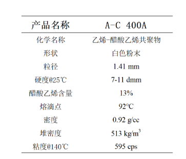 A-C 400A是有霍尼韋爾公司研發(fā)的一款乙烯-醋酸乙烯共聚蠟,擁有13%的游離醋酸乙烯含量。在塑料上可以作為很出色的分散劑,使得極性顏料、炭黑、填料能夠更好的在聚合物中分散開(kāi),在熱熔膠中能夠起到增加附著力和低溫降粘的作用。