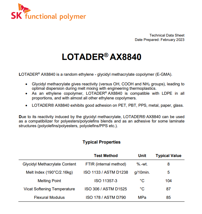 - EMA 法國阿科瑪Lotader AX 8840 粘接性好 無規(guī)共聚物 可分散 塑料改性 粘合劑 物性表, EMA 法國阿科瑪Lotader AX 8840 粘接性好 無規(guī)共聚物 可分散 塑料改性 粘合劑 產(chǎn)品參數(shù),EMA 法國阿科瑪Lotader AX 8840 粘接性好 無規(guī)共聚物 可分散 塑料改性 粘合劑 性能表,EMA 法國阿科瑪Lotader AX 8840 粘接性好 無規(guī)共聚物 可分散 塑料改性 粘合劑 出廠報(bào)告, MSDS,, 物質(zhì)安全資料表, UL黃卡,{ SGS報(bào)告, RoHS, 食品級(jí)認(rèn)證, NSF飲用水標(biāo)準(zhǔn), 產(chǎn)品資料, 產(chǎn)品性能, 出廠報(bào)告, 原廠原包, 代理商, 熱變形溫度, 熔指數(shù), 流動(dòng)系數(shù), 抗沖擊性能、沖擊強(qiáng)度, 低溫韌性、低溫抗沖擊性能, 熔體流動(dòng)系數(shù)、熔體流動(dòng)速率, 加工工藝、加工參數(shù)、加工溫度, 歐盟RoHS 德國FDA 美國FDA 日本FDA